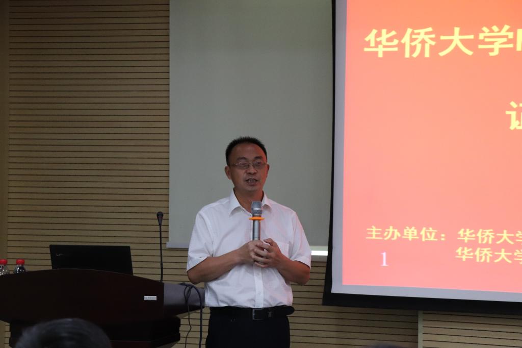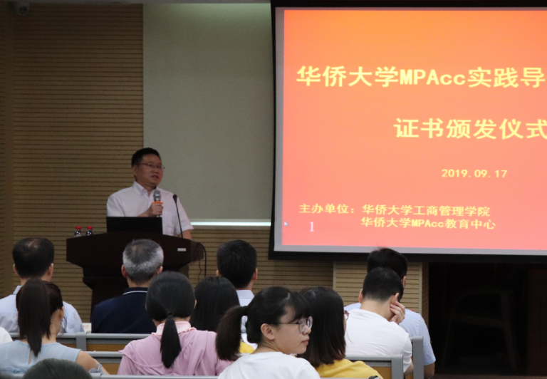 华侨大学MPAcc教育中心主任陈金龙教授发言,陈金龙主任首先对实践导师们表示感谢,接着对学生和实践导师之间的学习与相处提出几点建议。第一要发现问题,他通过举例说明实践问题与理论研究之间的差距,希望导师可以在日常的工作中提供数据供学生研究。第二陈主任对学生提出要求:实践导师忙于社会工作,学生要抓住机会,多与导师进行交流,学院也会举行多场实践交流讲座,希望能通过交流平台使同学们更加了解外部实践环境。第三希望通过实践导师和学生之间的互动能够研究泉州企业存在的问题。学生们要会想,会讲,会做,通过与实践导师之间的协同合作,提高整合能力,更好地总结实践经验、解决实践问题,最后,陈主任希望能通过师生共同努力,让实践导师制度成为MPAcc特色。