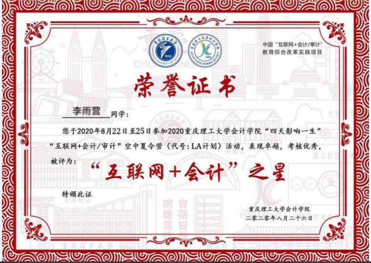经过四天紧张的培训与评比,李雨营同学以综合成绩第一荣获2020年“互联网+会计”之星荣誉称号,顺利结业。继去年杨晨昊同学荣获2019年“优秀营员”之后,我校学子又一次在重庆理工暑期夏令营中荣获奖项,彰显了华侨大学会计专硕学生奋发向上、永不服输的拼搏精神!主办方对于华大学子在夏令营中的表现,给予了高度肯定!