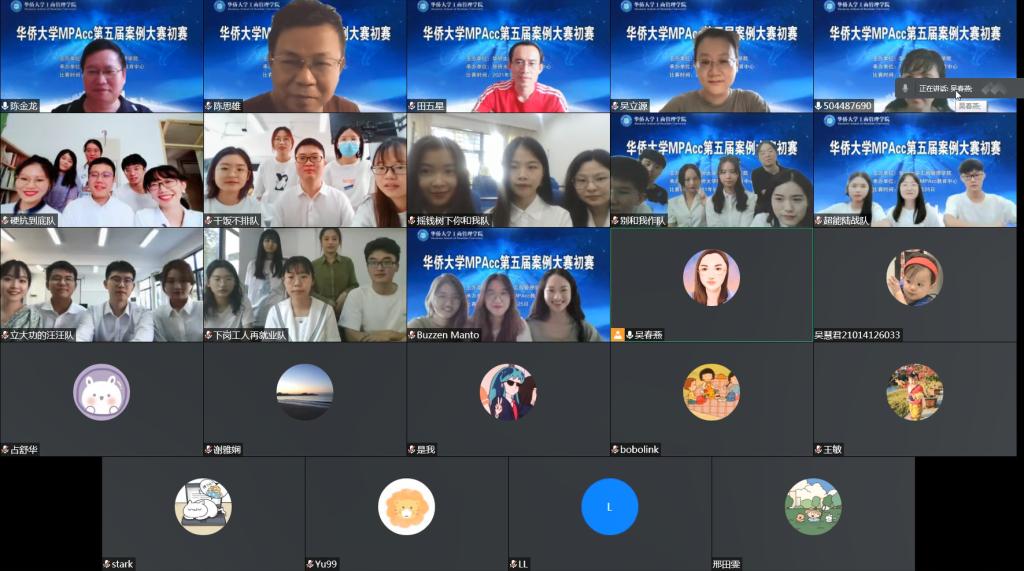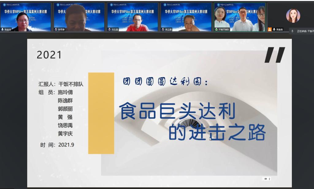 由于疫情原因,华侨大学会计专业硕士(MPAcc)第五届案例大赛初赛答辩于2021年9月25日上午在线上举行。本届案例大赛共有8个参赛小组,初赛答辩流程分为案例展示、问答环节以及评委打分三部分,并由曾繁英教授、陈金龙教授、吴立源副教授、田五星副教授、陈思雄副教授担任评委。